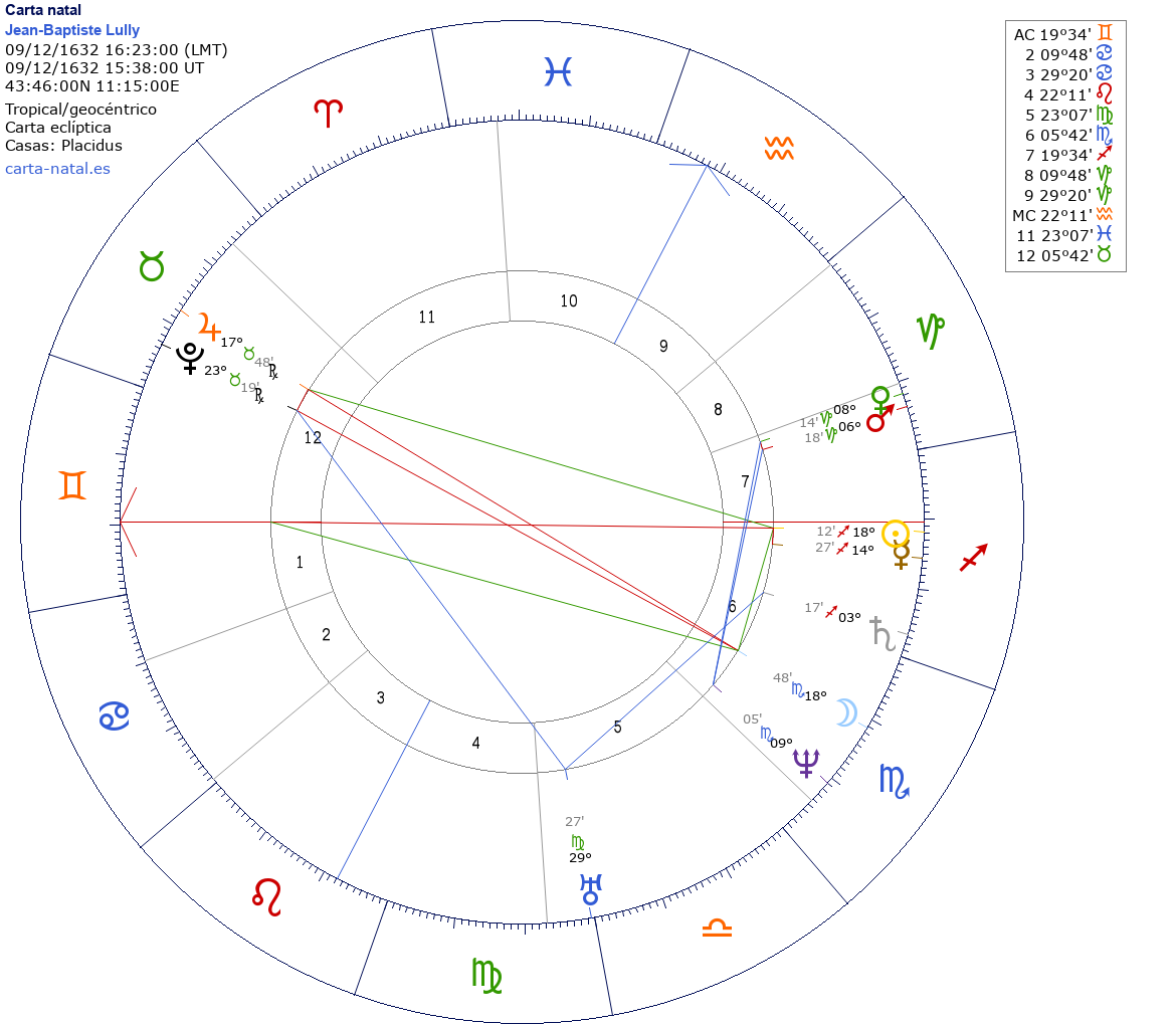 Jean-Baptiste Lully nació el 9 de Diciembre de 1632 a las 16:23:00 en Florence (Firenze), Italia