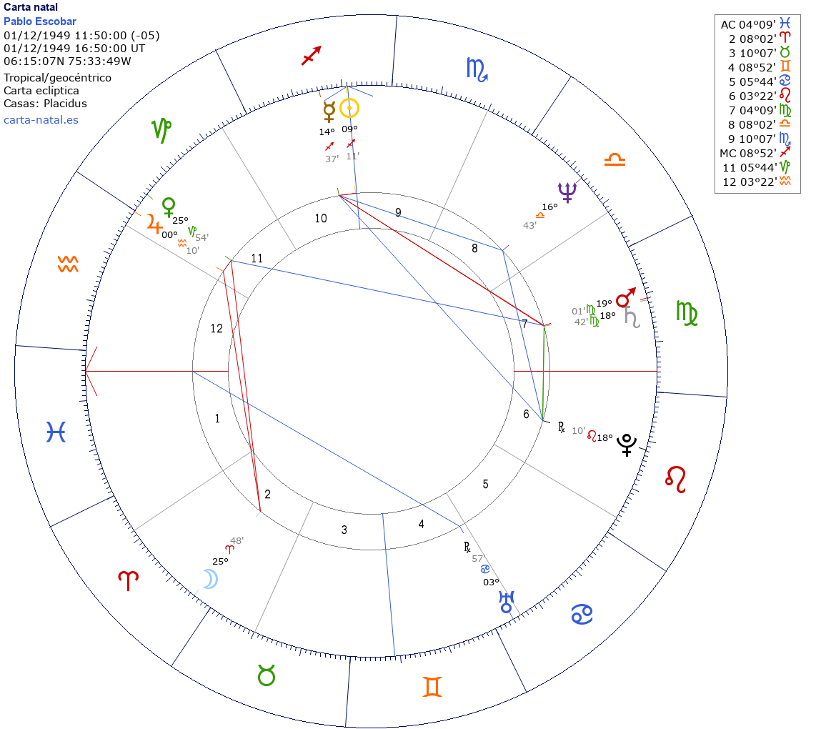 Pablo Escobar nació el 1 de Diciembre de 1949 a las 11:50:00 en Medellin (Antioquia), Colombia