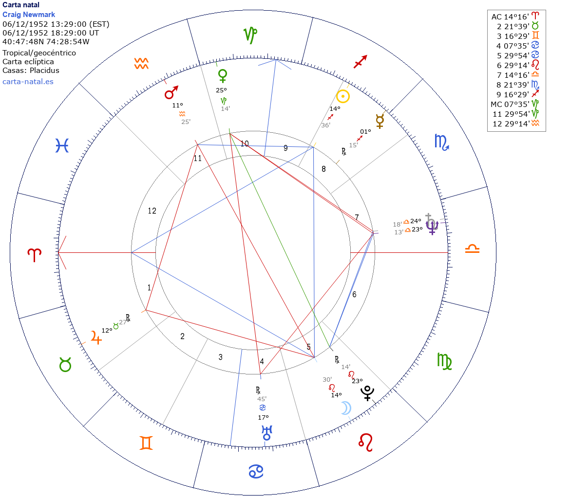 Craig Newmark nació el 6 de Diciembre de 1952 a las 13:29:00 en Morristown (Morris NJ), Estados Unidos