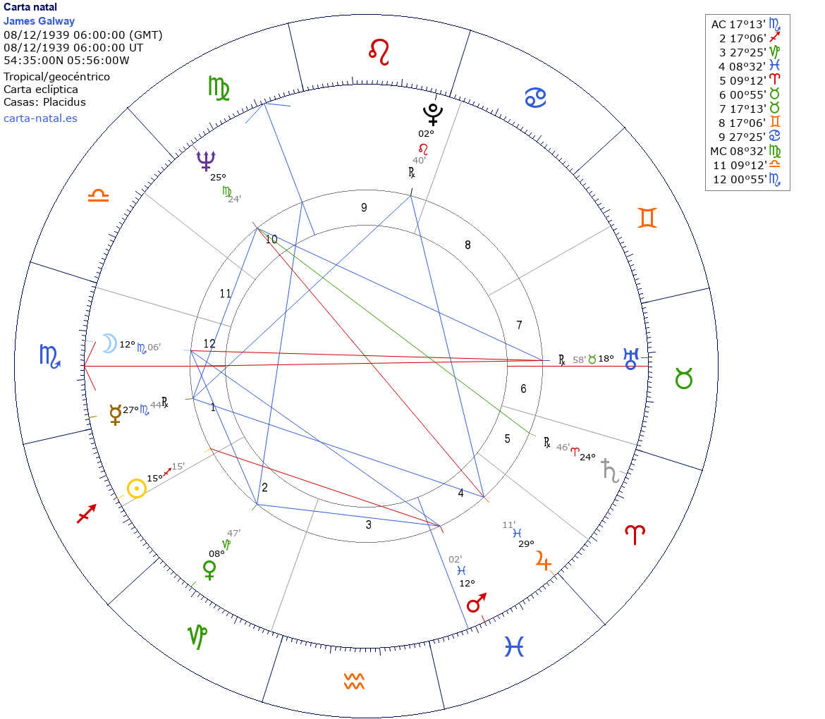 Esta es la carta natal de Sir James Galway, flautista británico.