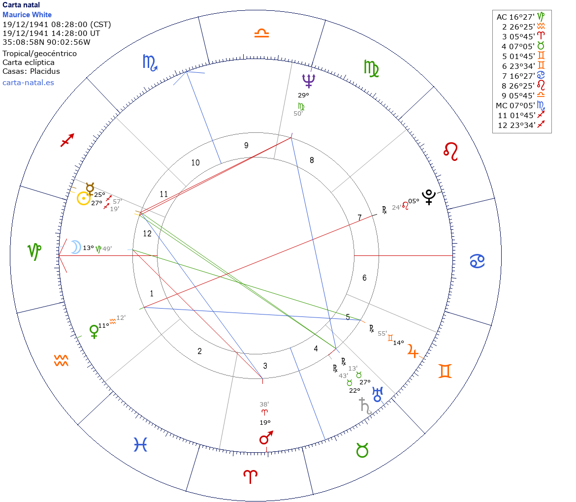 Esta es la carta natal de Maurice White, compositor y cantante estadounidense, fundador de la banda Earth, Wind & Fire.