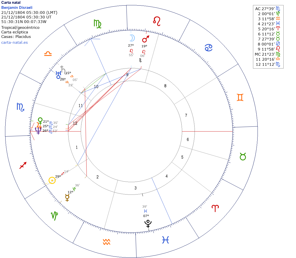 Esta es la carta natal de Benjamin Disraeli, político y escritor británico, I Conde de Beaconsfield.