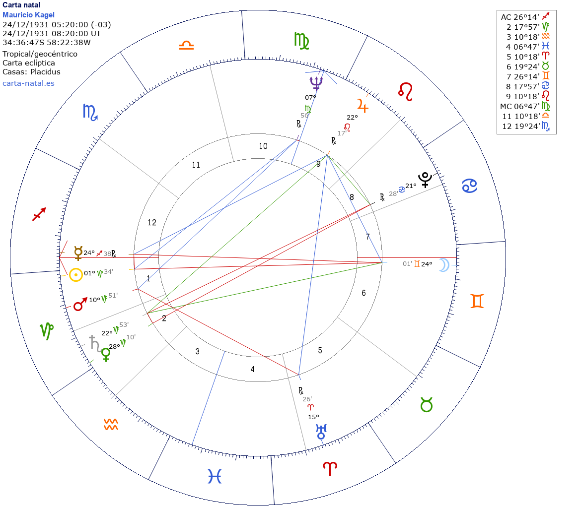Mauricio Kagel nació el 24 de Diciembre de 1931 a las 05:20:00 en Buenos Aires (Buenos Aires DF), Argentina