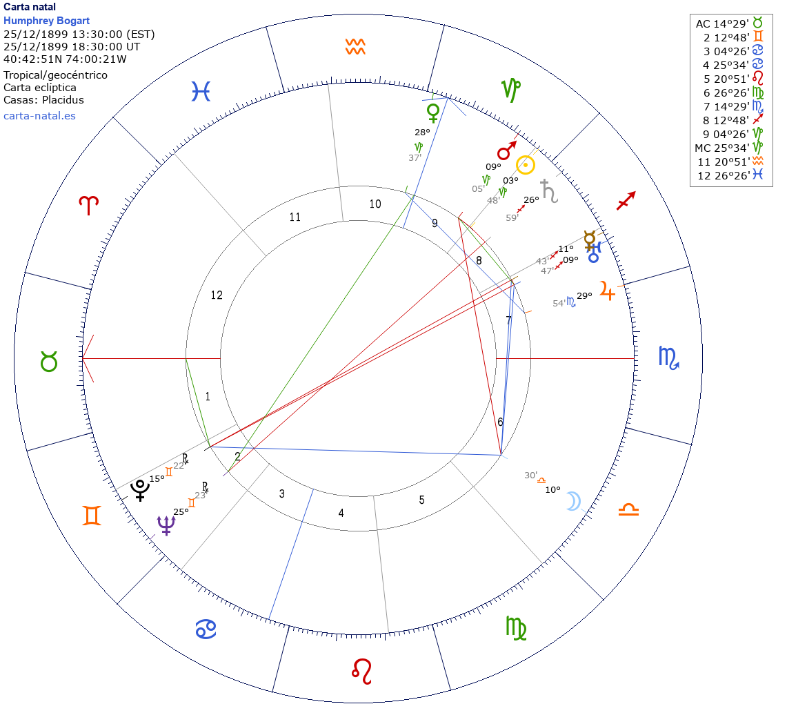 Esta es la carta natal de Humphrey Bogart, actor estadounidense.