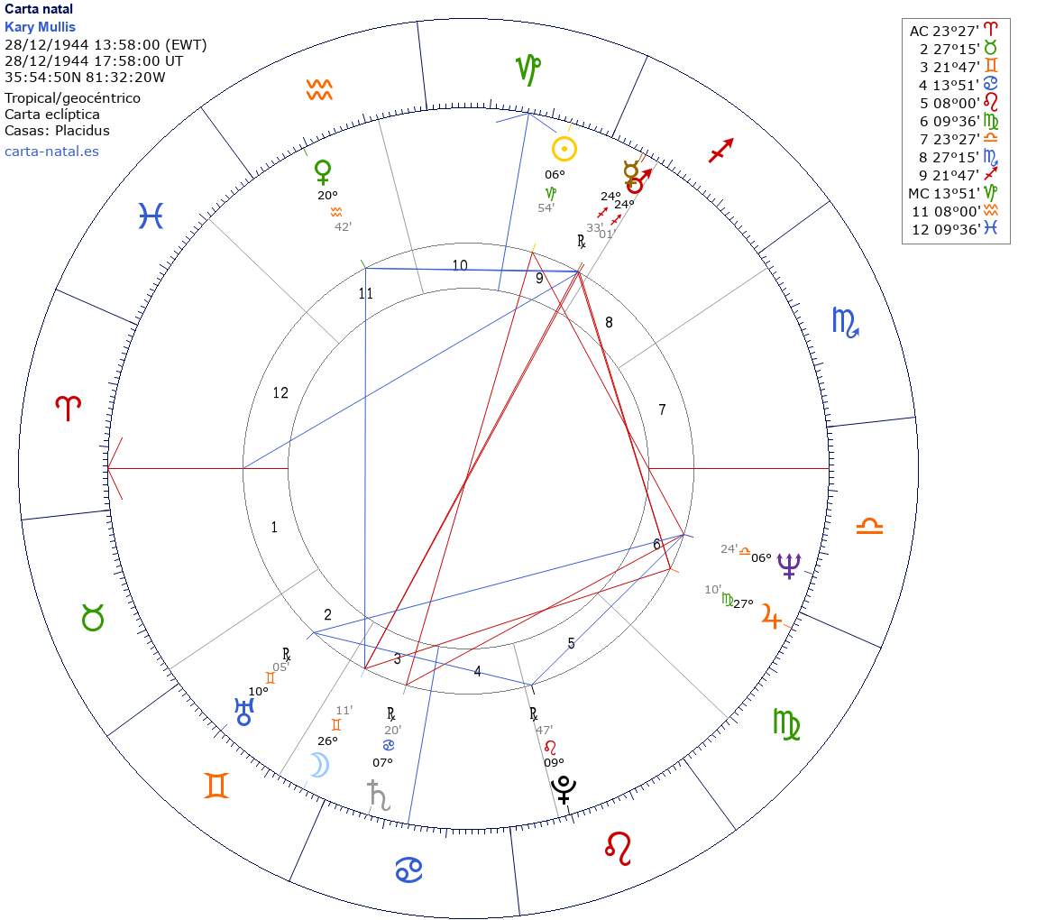 Esta es la carta natal de Kary Banks Mullis, bioquímico estadounidense inventor de la revolucionaria técnica de PCR, disidente del sida y de otras teorías actuales, Premio Nobel de Química en 1993.