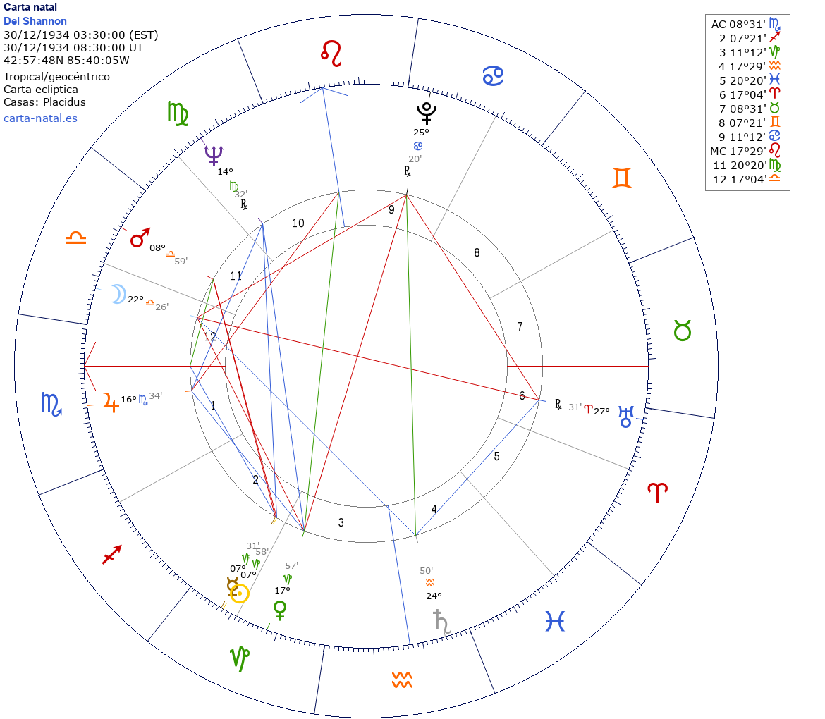 Esta es la carta natal de Del Shannon, cantante estadounidense.