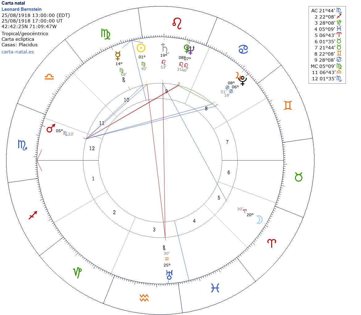 Esta es la carta natal de Leonard Bernstein, compositor y director de orquesta estadounidense.
