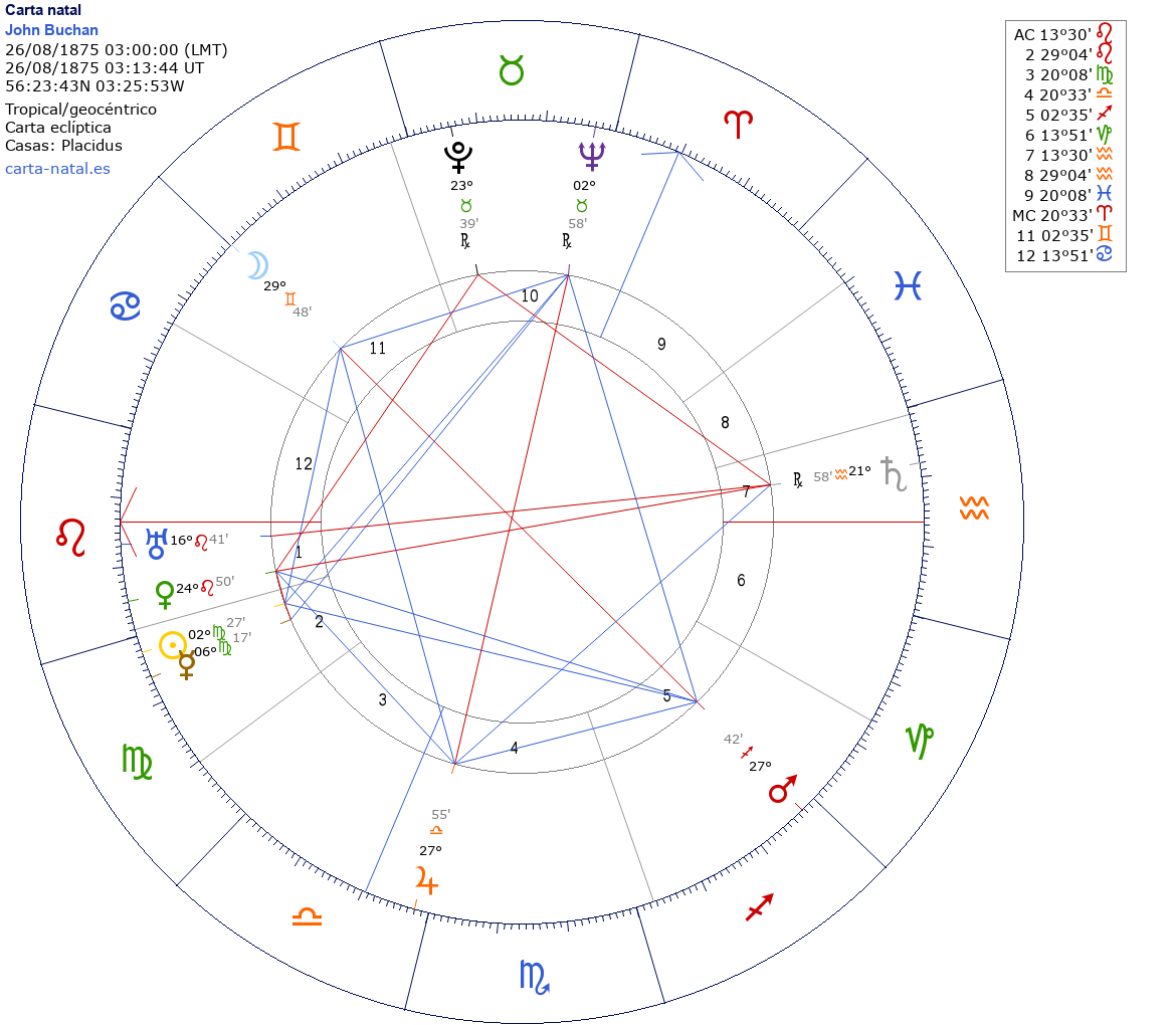 John Buchan nació el 26 de Agosto de 1875 a las 03:00:00 en Perth (Perth and Kinross SCT), Reino Unido
