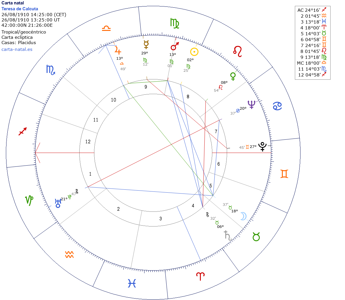 Teresa de Calcuta nació el 26 de Agosto de 1910 a las 14:25:00 en Skopje (Karpos), Macedonia