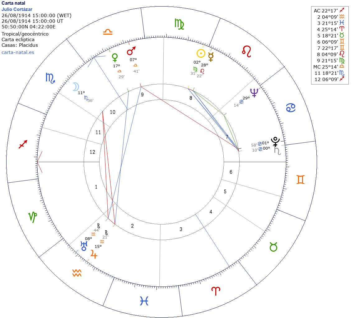 Julio Cortázar nació el 26 de Agosto de 1914 a las 15:00:00 en Ixelles (Bruselas Capital), Bélgica