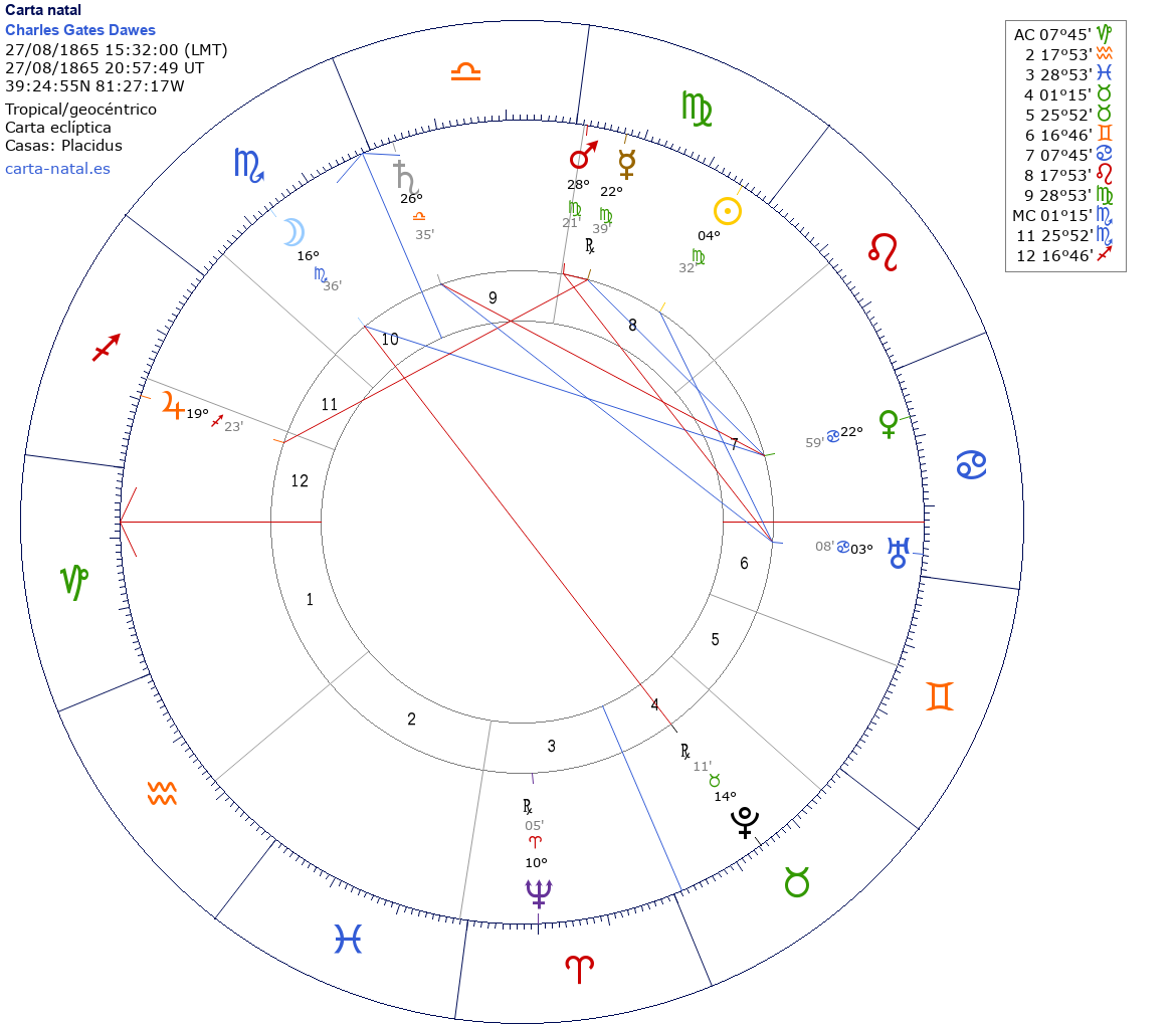 Esta es la carta natal de Charles Gates Dawes, político y financiero estadounidense, ex vicepresidente de los Estados Unidos, Premio Nobel de la Paz en 1925.
