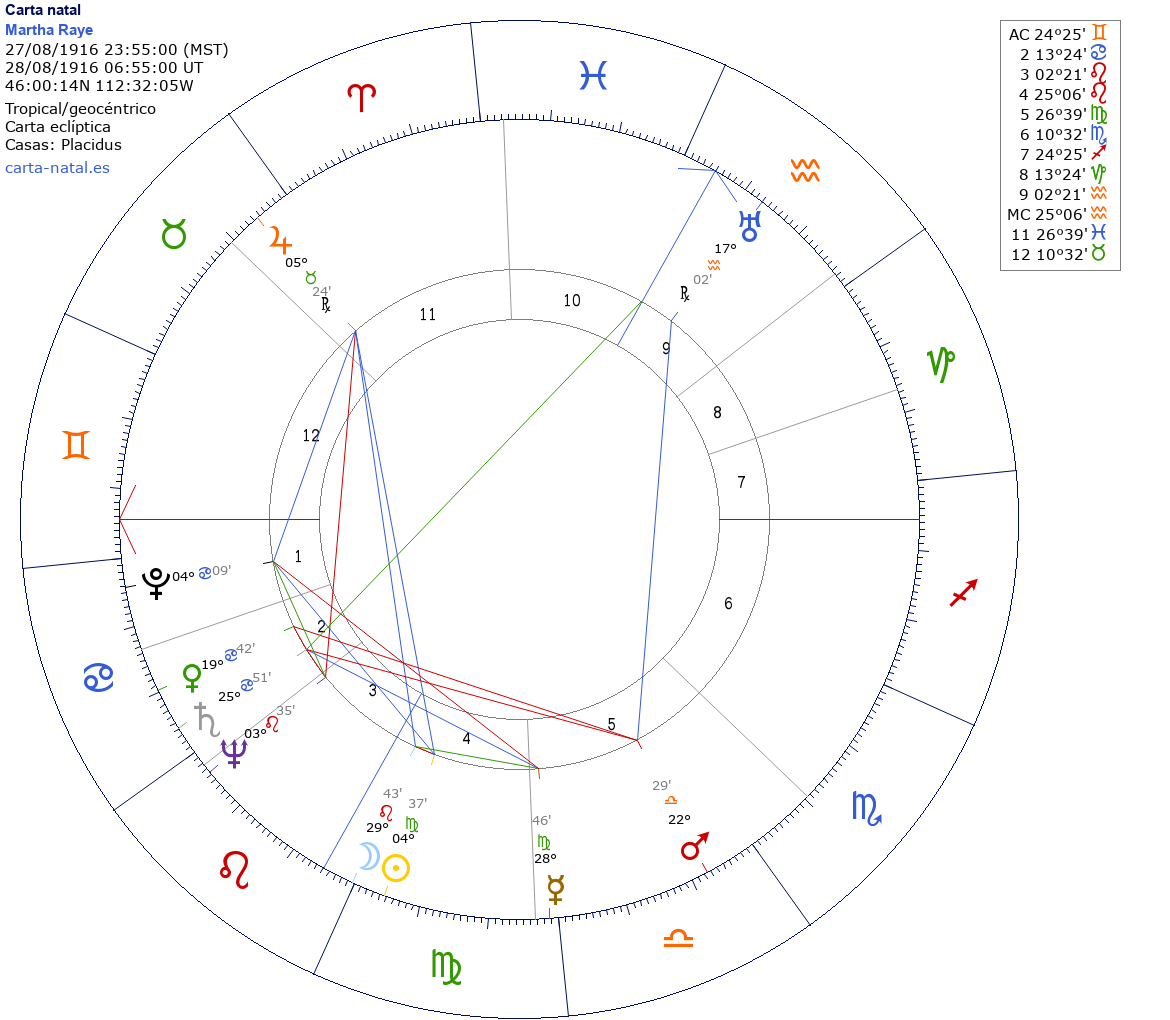 Esta es la carta natal de Martha Raye, actriz estadounidense.