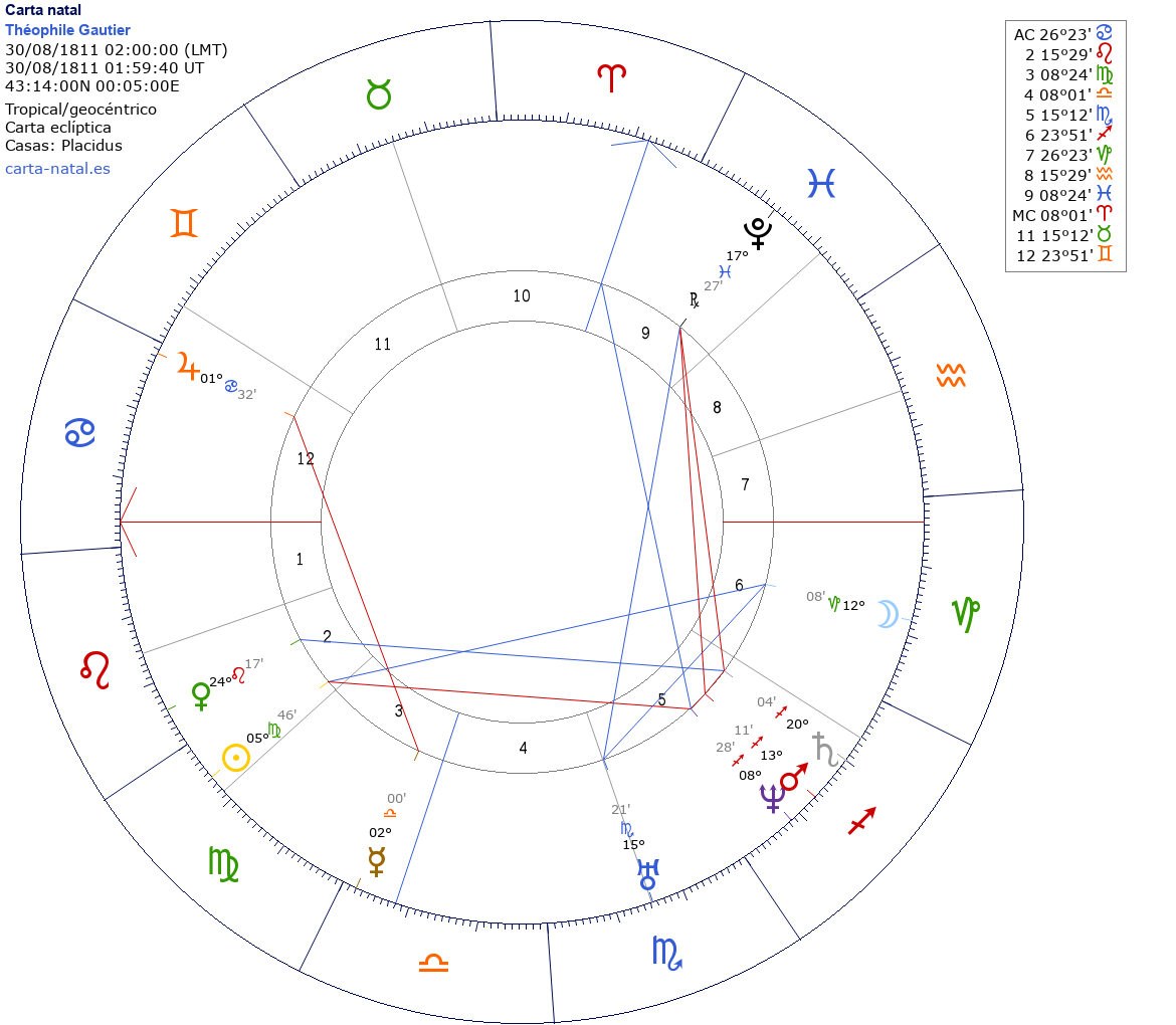 Théophile Gautier nació el 30 de Agosto de 1811 a las 02:00:00 en Tarbes (Mediodía-Pirineos), Francia