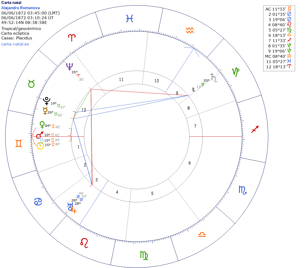 Esta es la carta natal de Alejandra Romanova, última emperatriz de Rusia.