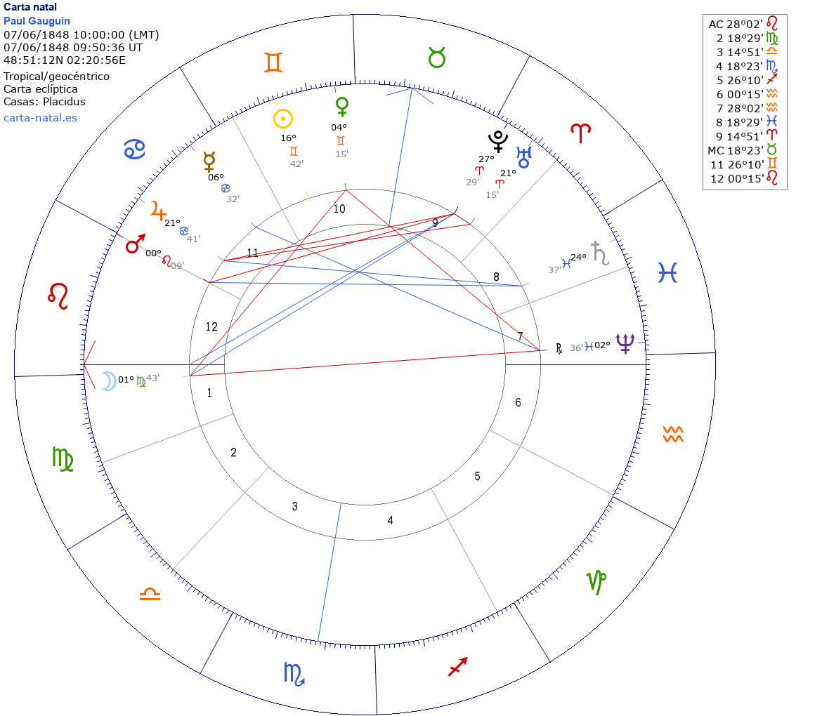 Paul Gauguin nació el 7 de Junio de 1848 a las 10:00:00 en Paris (Isla de Francia), Francia