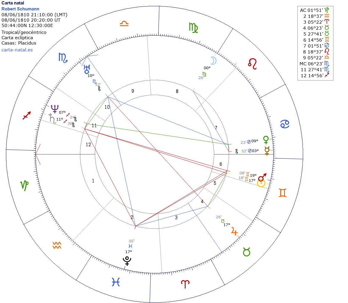 Robert Schumann nació el 8 de Junio de 1810 a las 21:10:00 en Zwickau (Sajonia), Alemania