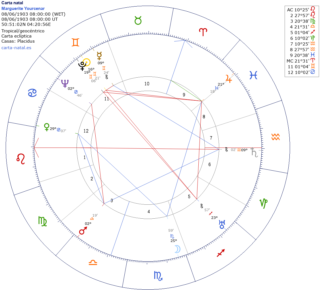 Marguerite Yourcenar nació el 8 de Junio de 1903 a las 08:00:00 en Brussels (Bruselas Capital), Bélgica