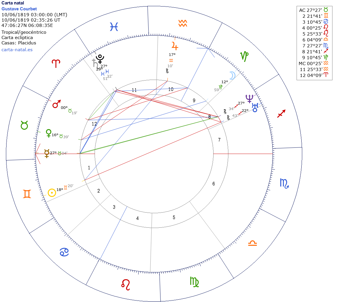 Gustave Courbet nació el 10 de Junio de 1819 a las 03:00:00 en Ornans (Franco Condado), Francia