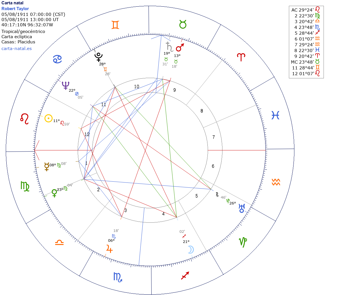 Esta es la carta natal de Robert Taylor, actor estadounidense.