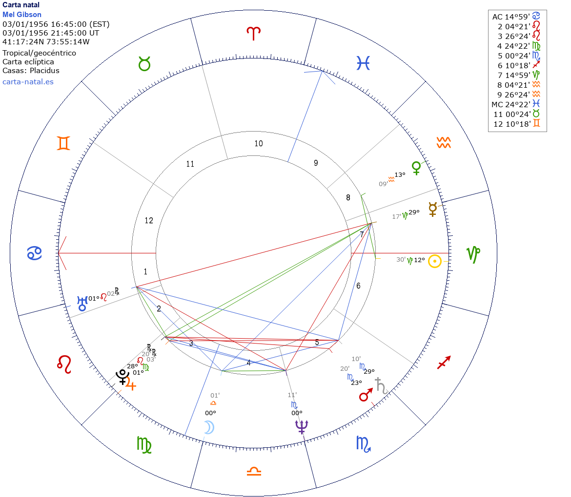 Esta es la carta natal de Mel Gibson, actor y direcor de cine estadounidense.