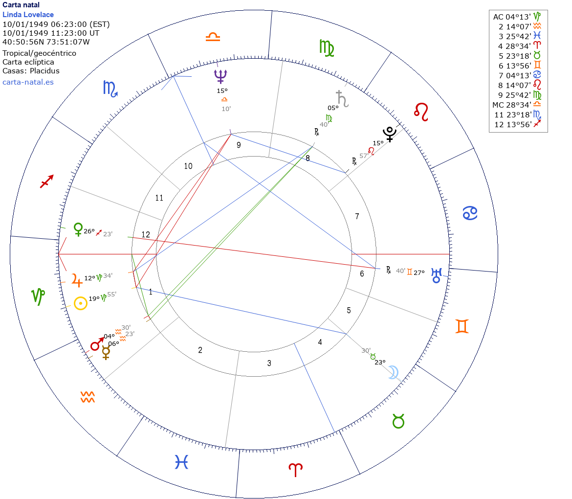 Esta es la carta natal de Linda Lovelace, actriz porno estadounidense.