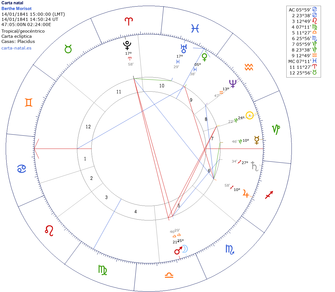 Berthe Morisot nació el 14 de Enero de 1841 a las 15:00:00 en Bourges (Centro), Francia