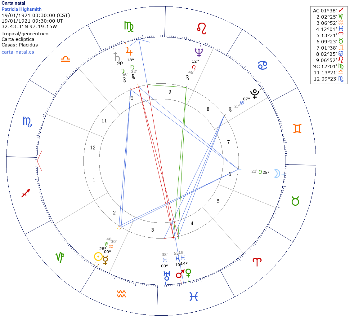 Patricia Highsmith nació el 19 de Enero de 1921 a las 03:30:00 en Fort Worth (Tarrant TX), Estados Unidos