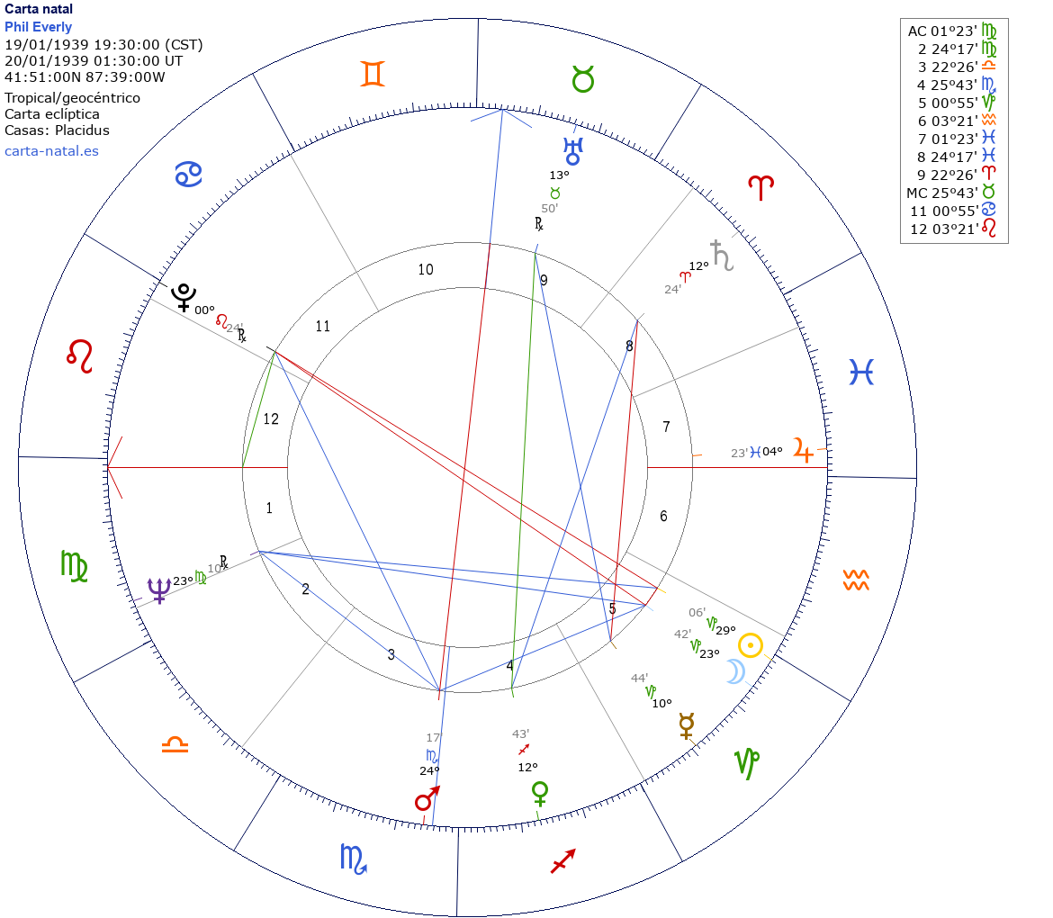 Esta es la carta natal de Phil Everly, músico estadounidense de The Everly Brothers.
