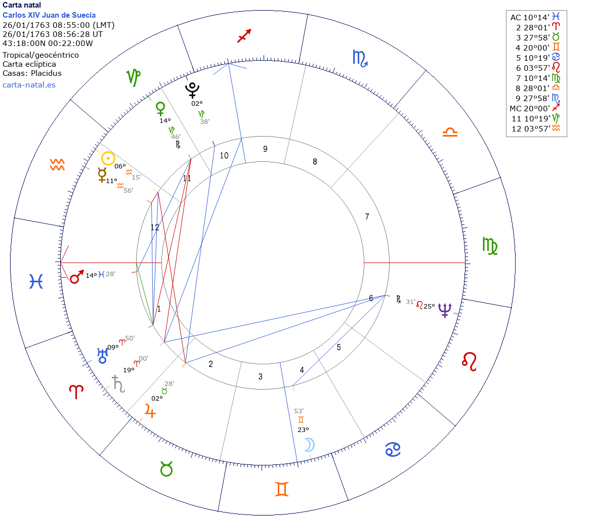 Carlos XIV Juan de Suecia nació el 26 de Enero de 1763 a las 08:55:00 en Pau (Aquitania), Francia