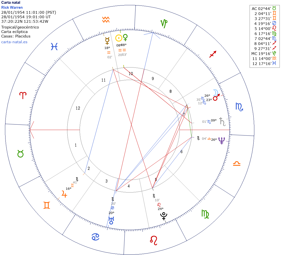 Rick Warren nació el 28 de Enero de 1954 a las 11:01:00 en San Jose (Santa Clara CA), Estados Unidos