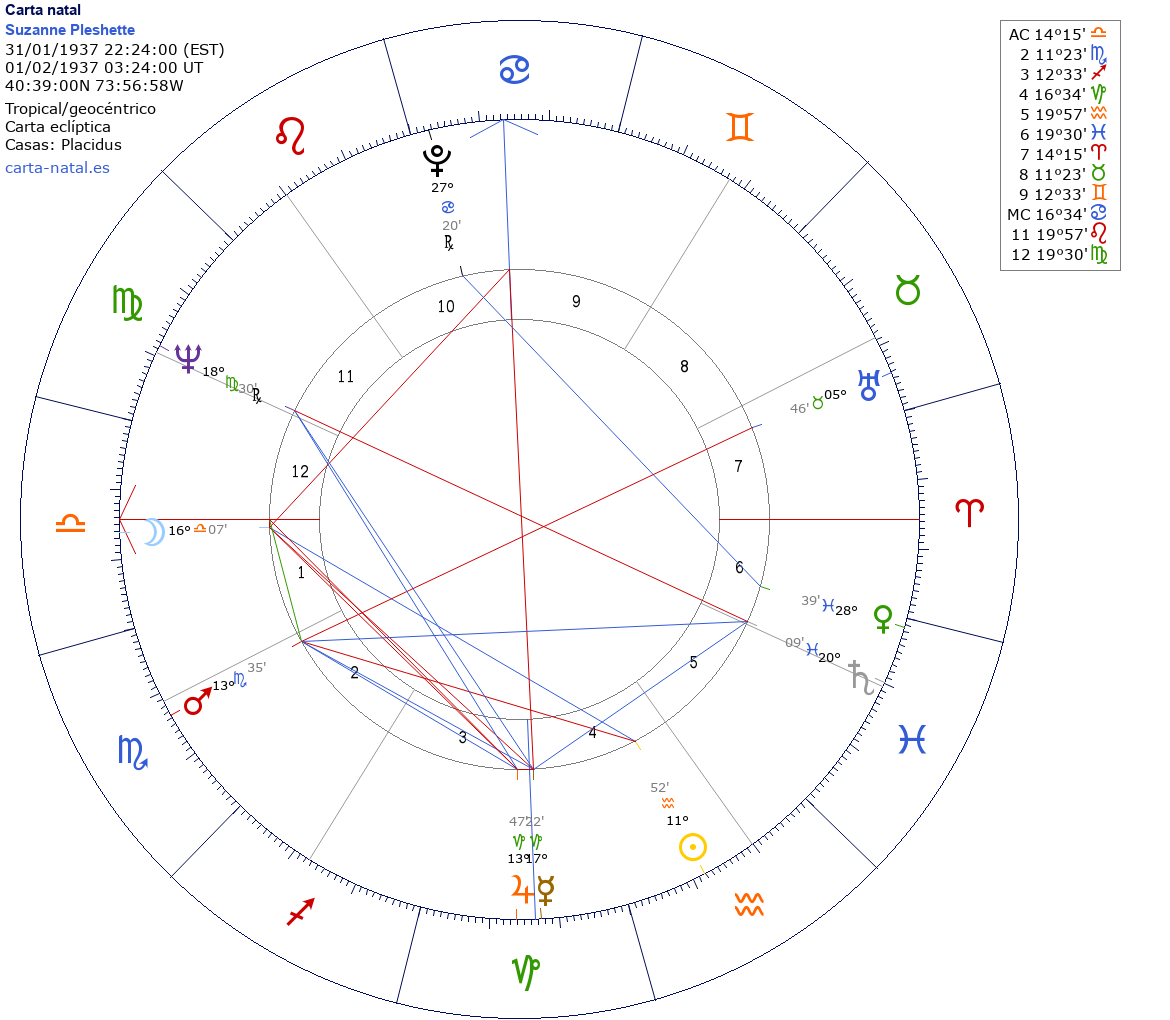 Esta es la carta natal de Suzanne Pleshette, actriz estadounidense.