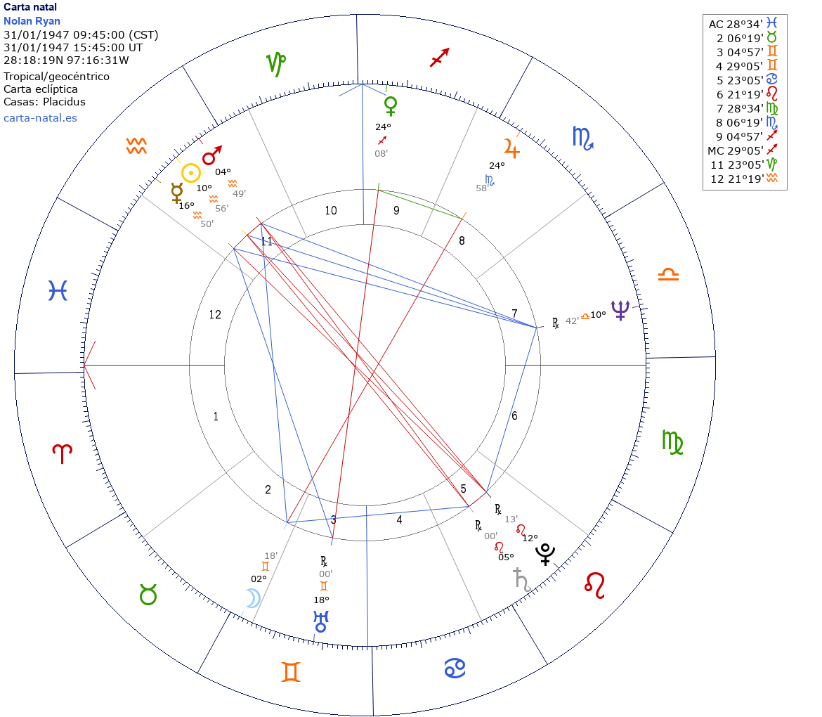 Nolan Ryan nació el 31 de Enero de 1947 a las 09:45:00 en Refugio (Refugio TX), Estados Unidos