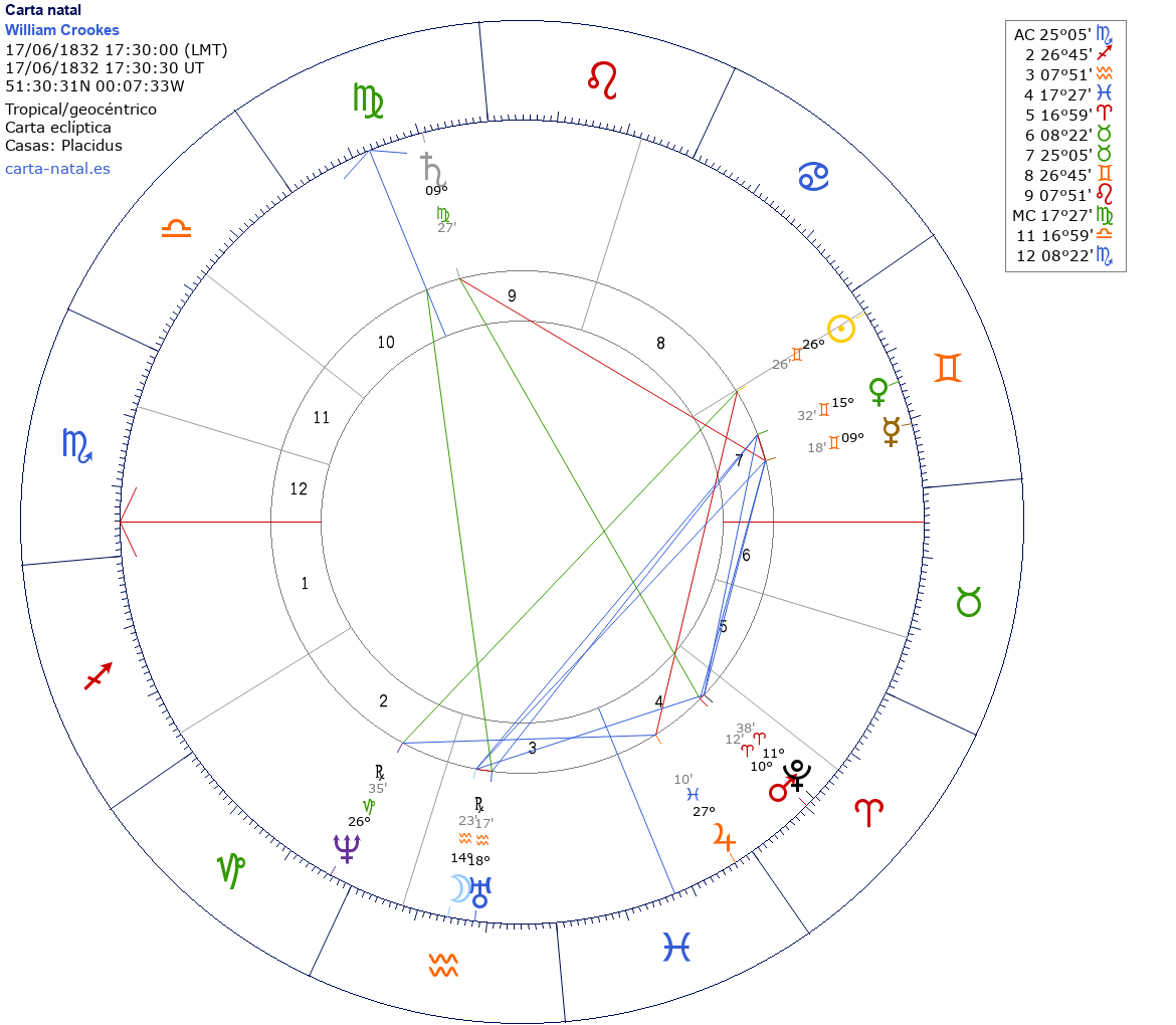 Esta es la carta natal de Sir William Crookes, físico y químico británico. (m. 1919)