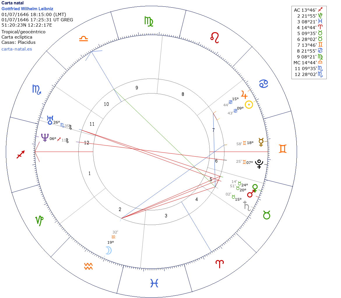 Esta es la carta natal de Gottfried Wilhelm Leibniz, filósofo y científico alemán (m. 1716).