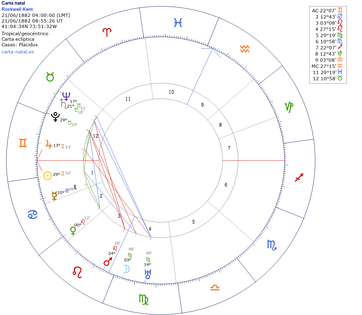 Esta es la carta natal de Rockwell Kent, artista estadounidense (m. 1971).