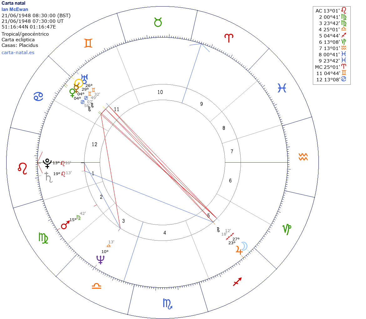 Ian McEwan nació el 21 de Junio de 1948 a las 08:30:00 en Ash (Kent ENG), Reino Unido