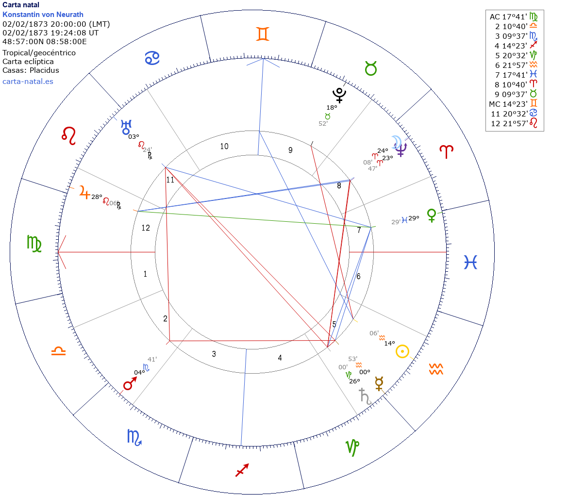 Konstantin von Neurath nació el 2 de Febrero de 1873 a las 20:00:00 en Kleinglattbach (Baden-Württemberg), Alemania