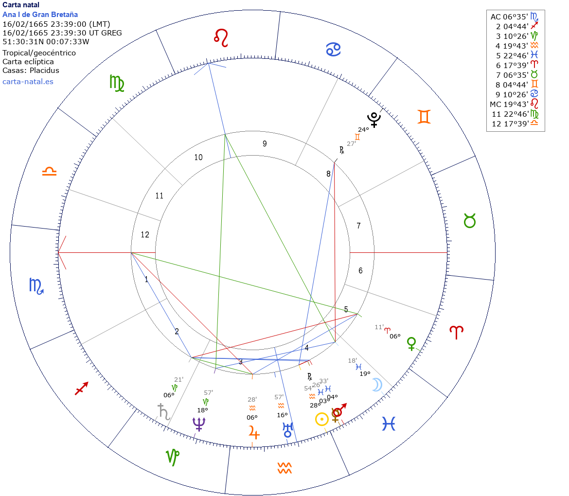 Esta es la carta natal de Ana I, reina de Gran Bretaña.