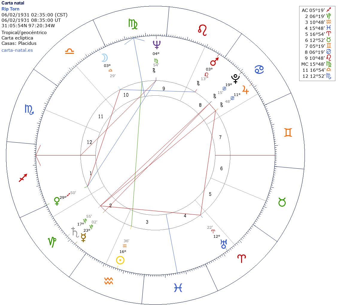 Esta es la carta natal de Rip Torn, actor estadounidense.