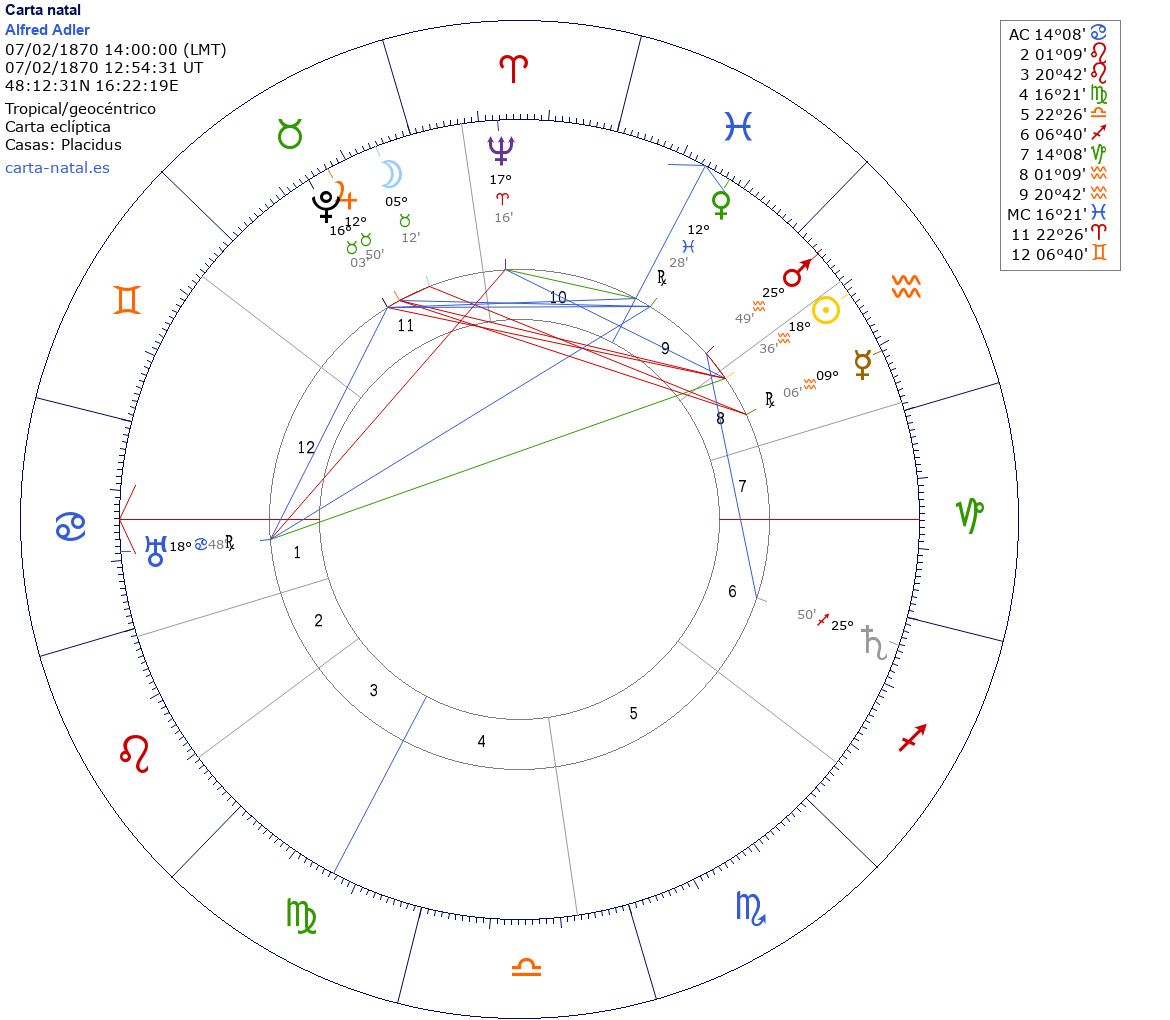 Esta es la carta natal de Alfred Adler, psicólogo austríaco.