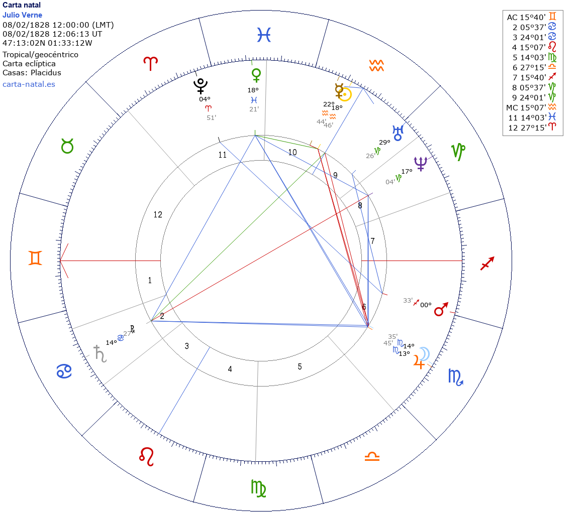 Julio Verne nació el 8 de Febrero de 1828 a las 12:00:00 en Nantes (Países del Loira), Francia
