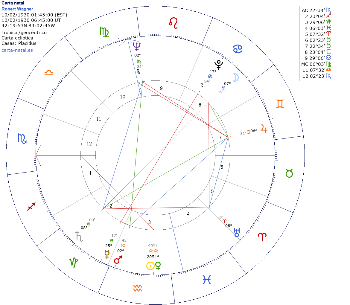 Esta es la carta natal de Robert Wagner, actor estadounidense.