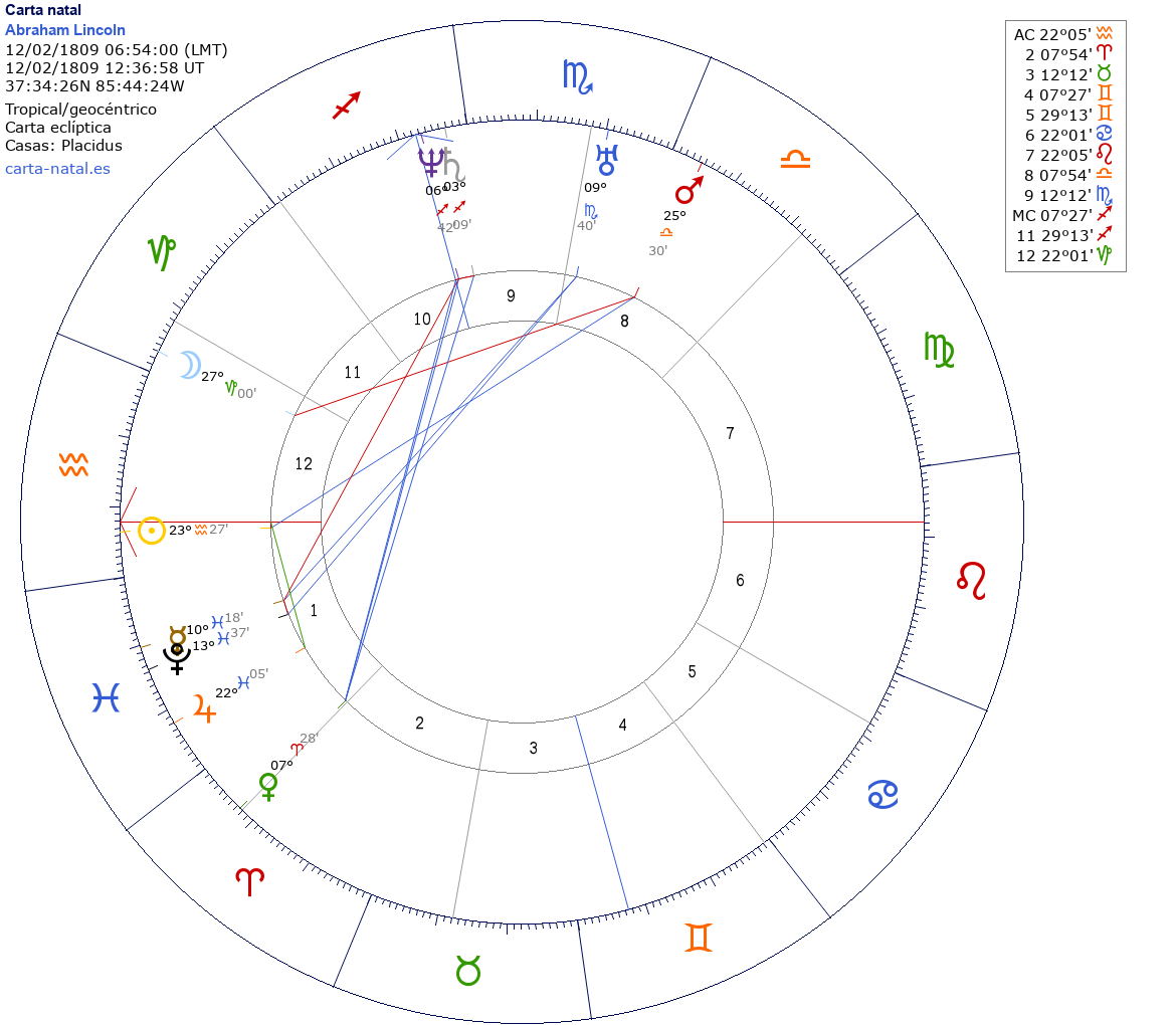 Abraham Lincoln nació el 12 de Febrero de 1809 a las 06:54:00 en Hodgenville (Larue KY), Estados Unidos