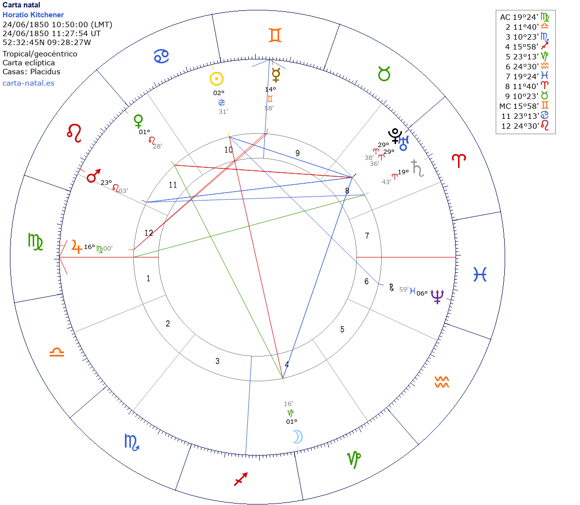 Horatio Kitchener nació el 24 de Junio de 1850 a las 10:50:00 en Ballylongford (Kerry), Irlanda