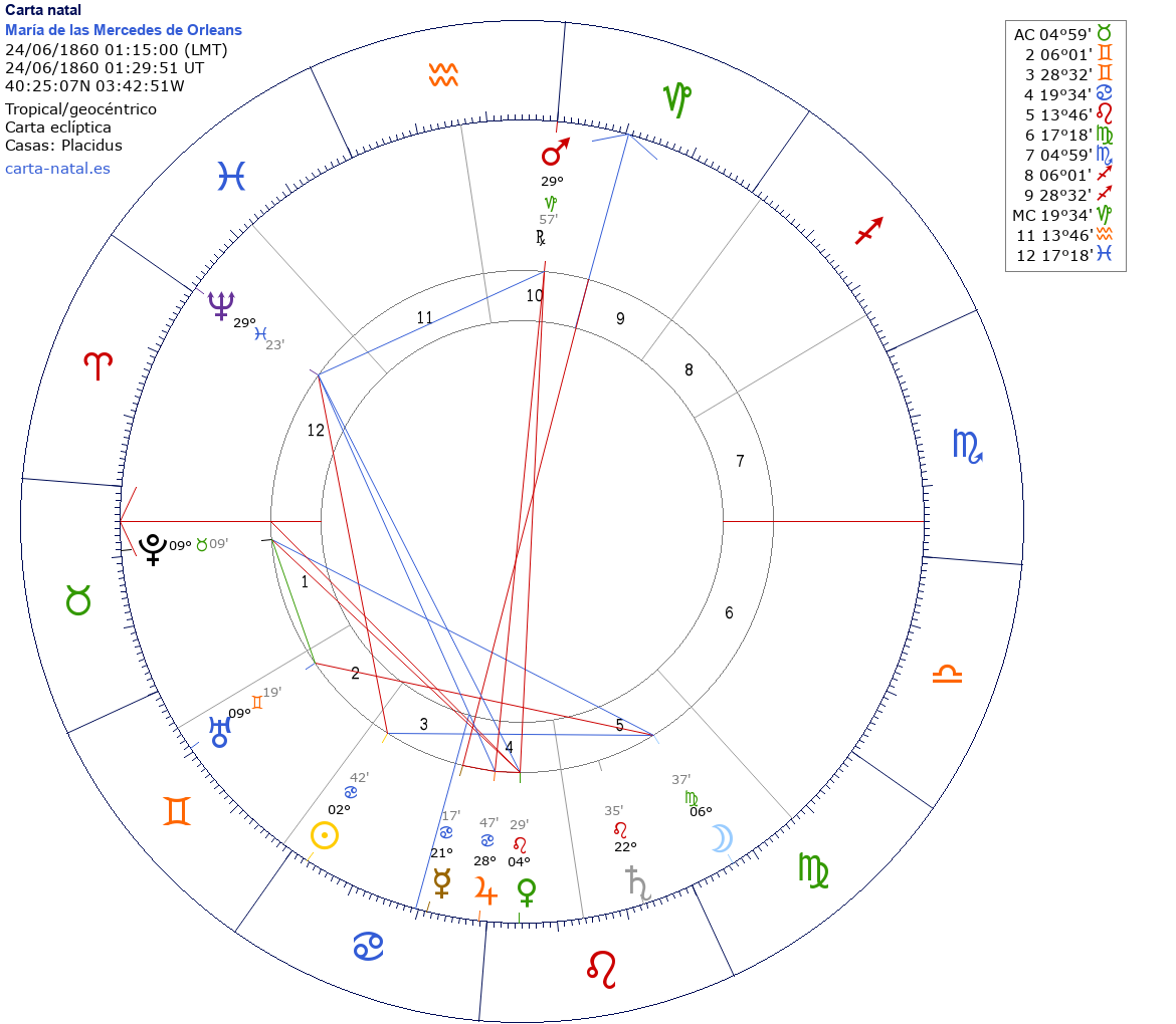 Esta es la carta natal de María de las Mercedes de Orleans, reina consorte de España.