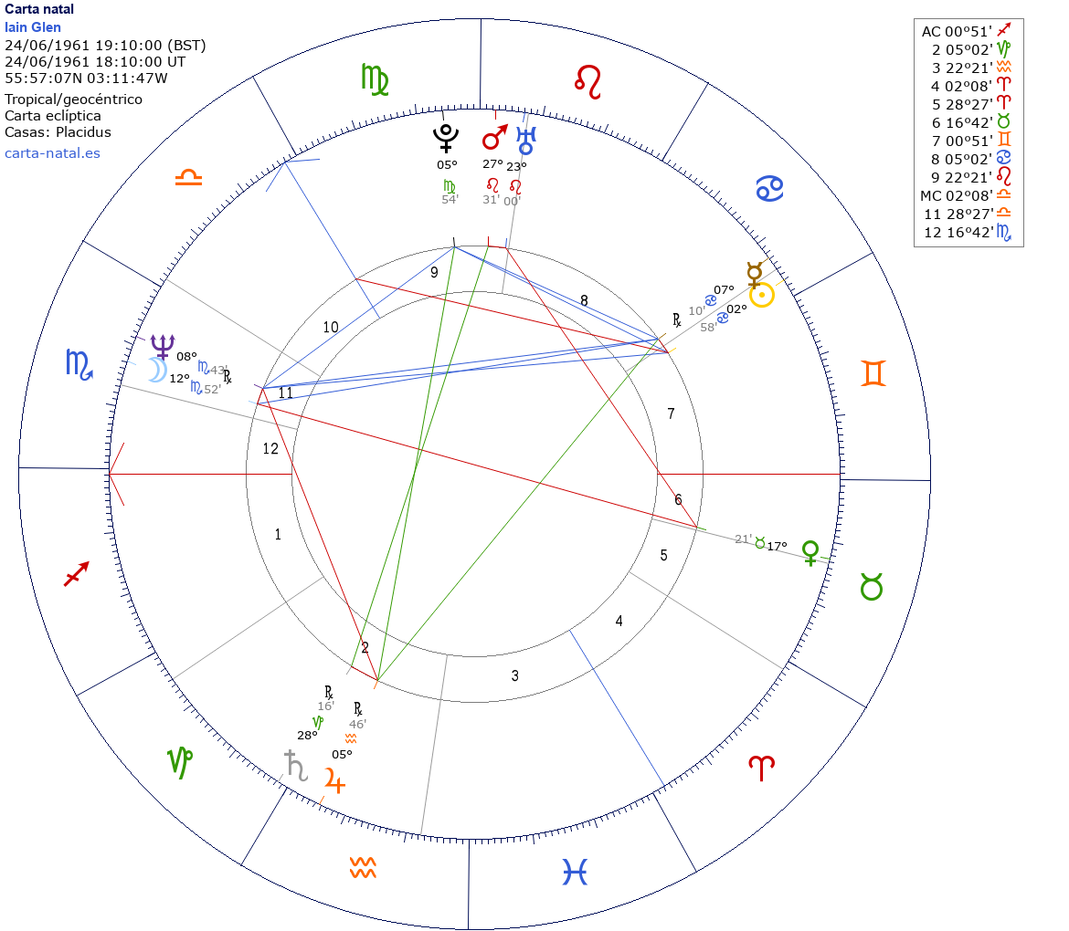 Esta es la carta natal de Iain Glen, actor escocés.