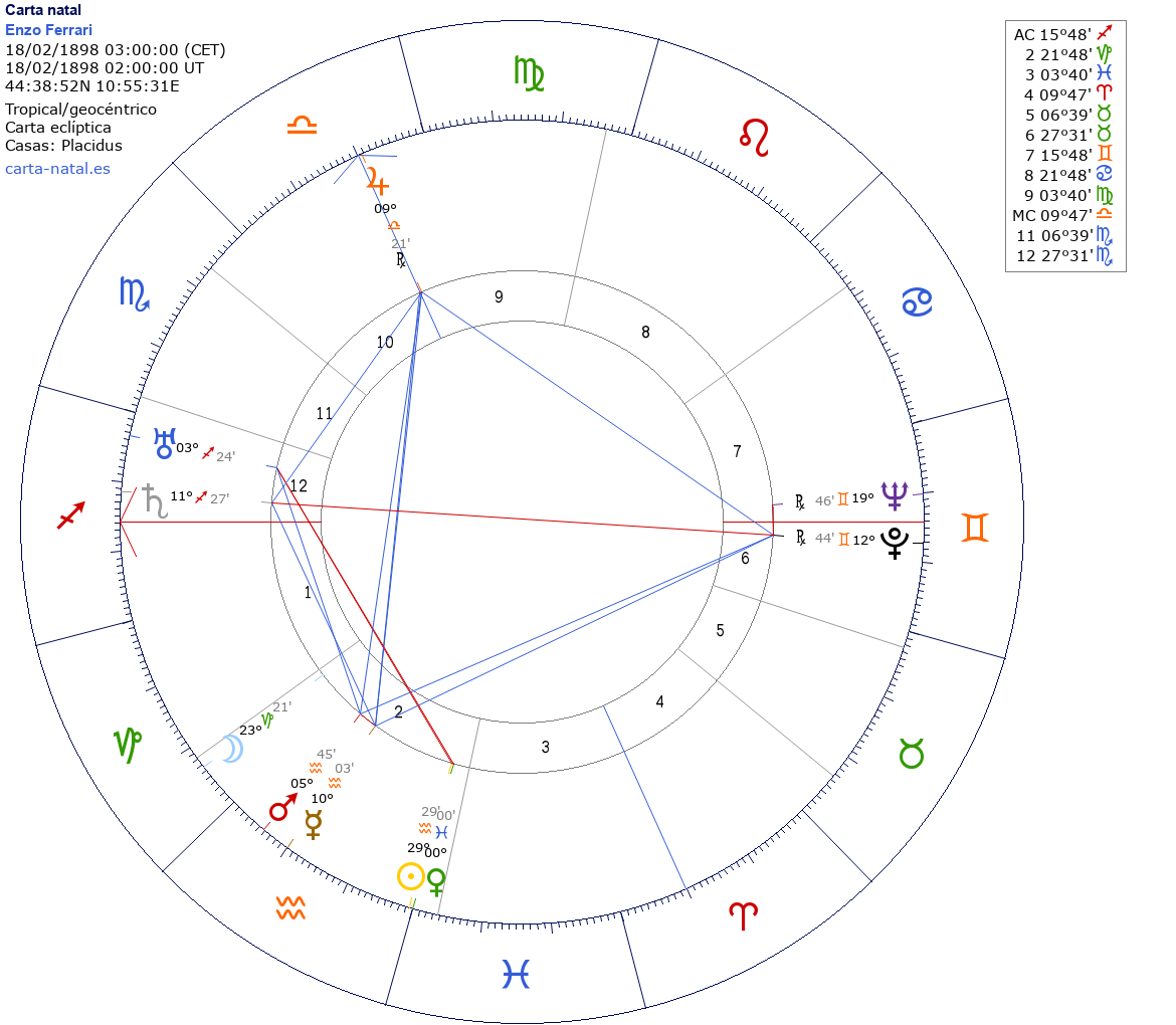 Enzo Ferrari nació el 18 de Febrero de 1898 a las 03:00:00 en Modena (Modena), Italia