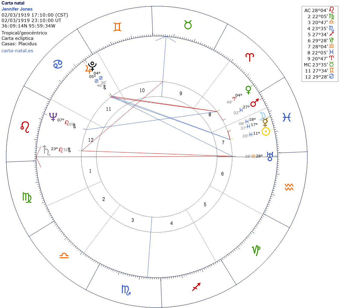 Esta es la carta natal de Jennifer Jones, actriz estadounidense