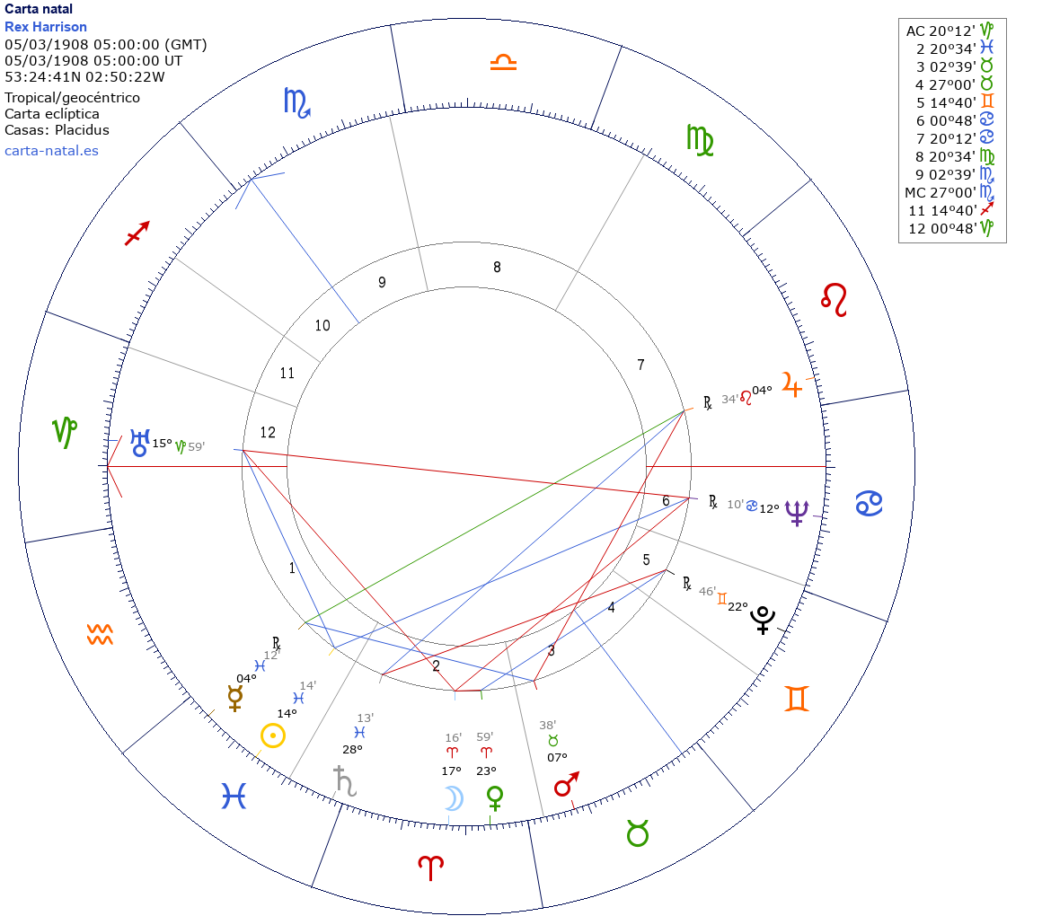 Esta es la carta natal de Rex Harrison, actor británico.