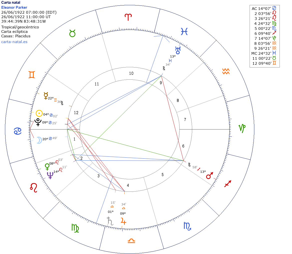 Esta es la carta natal de Eleanor Parker, actriz estadounidense.